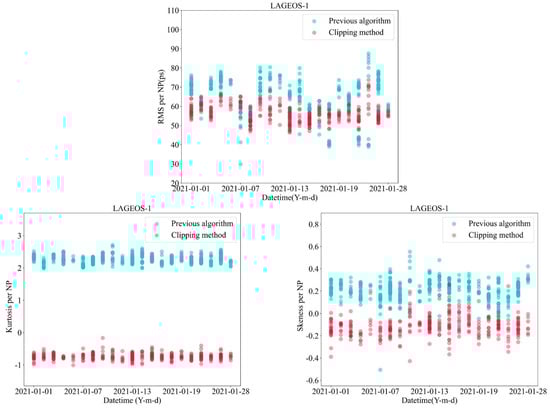 In order to verify the validity and applicability, we analyze the LAGEOS-1 observation data of different months with these two pre-processing methods. The calculated results of RMS, skewness, and kurtosis per normal point are illustrated in Figure 9. It is seen that the RMS per normal point (NP) obtained by the clipping method has decreased significantly and become more concentrated, while the skewness and kurtosis are also obviously reduced. Compared to the normal point algorithm, LAGEOS-1 observation data processed by the clipping method has higher precision and better stability and reliability, which indicates that the clipping method can not only eliminate the long-term but also reduce the short-term satellite signature effect from raw ranging data files.