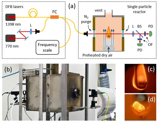 (a) Schematic drawing of the experimental setup including the two DFB lasers, the single particle reactor (SPR) and the optical detection system. FC—fibre combiner, BS—beam splitter, PD—photodetector, OF—optical filter. (b) Photograph of the SPR with TDLAS optics mounted. (c) Representative photograph of a biomass particle inside the SPR during devolatilization. (d) Representative photograph of a biomass particle inside the SPR during char conversion.