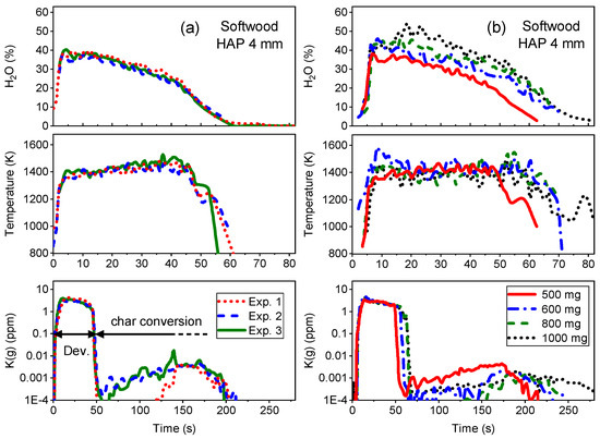 Figure 2 displays H2O concentration, gas temperature and K(g) concentration at HAP 4 mm above softwood particles as a function of conversion time. Figure 2a shows three repetitions for an initial particle mass of 500 ± 10 mg, whereas Figure 2b presents the results for four different initial particle masses (500, 600, 800 and 1000 mg). Since the H2O concentration during char combustion was below the detection limit of the TDLAS sensor (<0.1%), H2O and temperature could only be reliably assessed in the devolatilization stage (Dev.), while the K(g) time series includes the char conversion. The gas temperature above the particle during char burning was close to the SPR set temperature (1123 K).