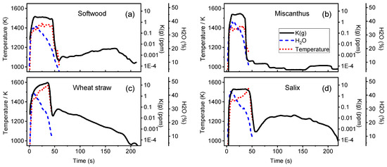 Figure 3 displays (on the same scales) time series of simultaneously measured H2O, gas temperature and K(g) at HAP 4 mm above softwood (Figure 3a), Miscanthus (Figure 3b), wheat straw (Figure 3c) and Salix (Figure 3d) particles with initial mass of 500 ± 10 mg. In accordance with the energy density data shown in Table 1, the pyrolysis of woody-type fuels (softwood, Salix) takes longer than that of straw-based fuels (wheat straw, Miscanthus). Softwood has the highest energy density and longest devolatilization time (~60 s), while Miscanthus has the lowest energy density and shortest pyrolysis time (~40 s).