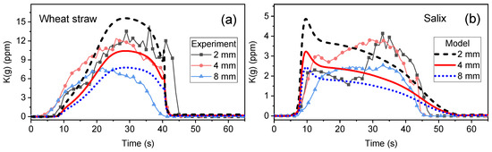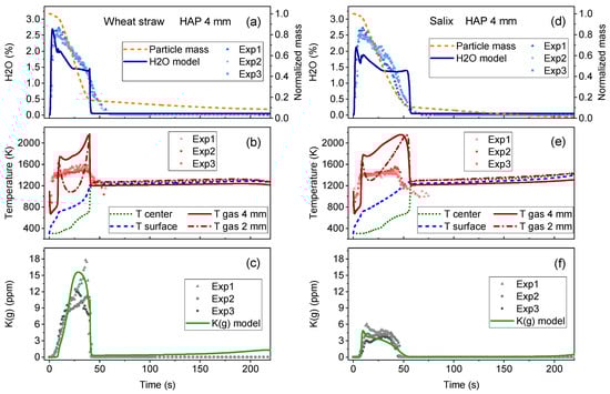 Figure 4 presents a comparison between TDLAS-measured (3 replicates) and model-predicted average H2O concentration, gas temperature and average K(g) concentration for wheat straw (Figure 4a–c) and Salix (Figure 4d–f) at a HAP of 4 mm. In addition to H2O, panels (a) and (d) also display the predicted normalized particle mass during conversion. In Figure 4b,e, the experimental gas temperature at HAP 4 mm is compared to the predicted temperature at HAP 2 and HAP 4 mm, as well as the predicted temperatures at the particle centre and surface. Overall, a similar behaviour is observed for the two fuels. The minor differences stem from the higher ash content of the wheat straw samples and the differences in the particle densities, as presented in Table 1. As seen in both experiments and simulation, the devolatilization process was shorter for the wheat straw particle (~40 s) than for Salix (~50 s).