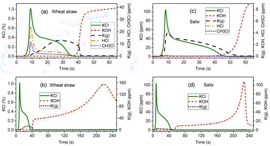 In order to give an overview of the expected release behaviour of all three main K species, Figure 6 presents the concentrations of gaseous KOH, KCl, K(g), HCl and chloromethane (CH3Cl) for wheat straw (Figure 6a,b) and Salix (Figure 6c,d) as predicted by the numerical model. Panels (a) and (c) show the devolatilization phase in detail, while panels (b) and (d) display both devolatilization and char combustion.