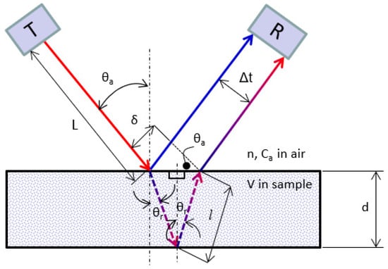 Here, l is the refracted length in the sample, d is the thickness of specimen, v is the velocity in the specimen, Ca is the velocity in the air, l is the refracted length in the sample, is the skip length of refractive waves in the sample, θr is the refraction angle in the specimen, and θa is the refraction angle in the air. The refractive index, which is one of the electromagnetic properties, can be calculated by following the steps above.