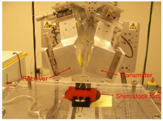 Figure 3 exhibits the T-ray measurement system, which demonstrates the reflection mode. When the test was carried out in this system, the T-ray was created from the emitter and sent to the receiver. At this time, the test was carried out by matching the focal point of the emitter and the receiver with the desired specimen. Then, the angle of inclination of the T-ray lens was determined as 16.6°. Figure 4 shows the Shim stock films and GFRP composites. The thicknesses of the Shim stock films were 0.127 mm, 0.254 mm, 0.381 mm, 0.508 mm, and 0.762 mm, and the thicknesses of GFRP composites were 2.02 mm, 3.08 mm, 5.74 mm, and 5.92 mm, respectively. Figure 5 shows typical A-scan data, which is the reflection mode of the GFRP composites of the T-ray. The thickness of the specimen was 3.0 mm.