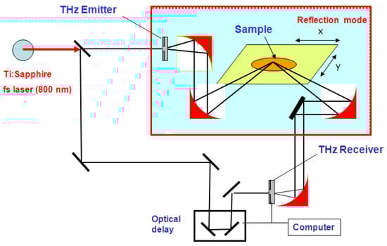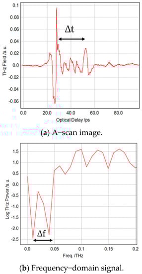 Owing to its broad utilization and far-ranging applications, the THz-TDS techniques could have the possibility to become a portable THz image. This approach is composed of two sections, which both involve the use of the T-ray. First, the importance of fiber-reinforced plastics (FRP) in the space and civil aviation fields is generally well known, and the FRP-laminated plate is widely used. In addition, the waveforms of terahertz pulses in the TDS mode have a strong resemblance to those of ultrasonic tastings. Regarding wave propagation concepts such as time of flight (TOF), transmission and reflection coefficients, refraction and diffraction are common to both waves. However, there are also fundamental differences when materials are probed with terahertz radiation, an electromagnetic wave, and with ultrasound, a mechanical wave [11]. In order to measure the thickness of a specimen using conventional ultrasonic waves, a couplant medium is always required, which makes the ultrasonic waves easily propagated. In the case of using air as a couplant medium, selecting ultrasonic frequency is narrowly ranged; thus, there is a limitation to measuring thinner samples. Therefore, due to the couplant medium, the factors affecting the accuracy of the measurements should be considered such as attenuation, diffraction, and dispersion of the samples [12]. By the way, the terahertz wave used in this study requires no couplant medium and is utilized under the mode of noncontact. Thus, the terahertz wave could make better reproducibility of data produced and also a higher frequency could be selected, which could bring the stronger measurement of thickness in case of thin samples.