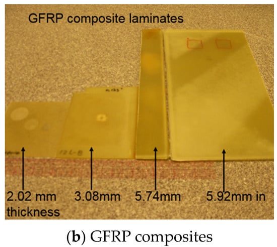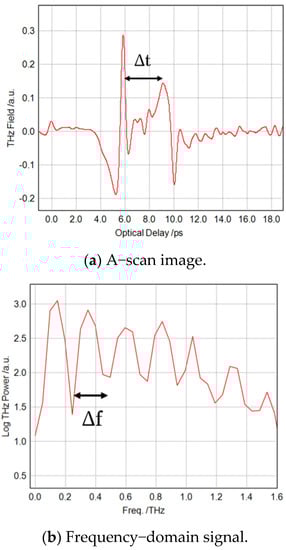 Figure 8a shows the difference (Δt) in the time-of-flight (TOF), which indicates the difference between the surface and the back of the GFRP composites. Figure 8b represents Figure 8a as the FFT domain, and Δf exhibits the resonance frequency, which is related to the thickness of the GFRP composites. Here, Δt is the TOF difference. Namely, 1/Δt should be Δf. The thickness of the GFRP composites was 2.02 mm.