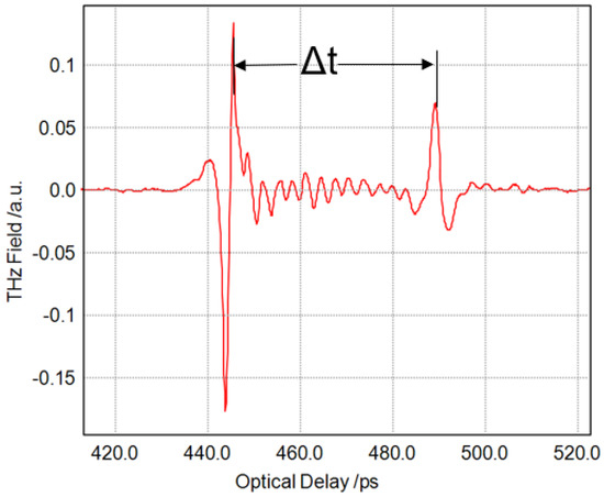 To measure the T-ray parameter which indicated the material properties, the THz pulse was obtained from the Shim stock films and GFRP composites in the reflection mode. Figure 5 clearly shows the time difference (Δt) between the surface and the back of the GFRP composites in the reflection mode. GFRP was used for the specimen, and the thickness of specimen was approximately 3.0 mm. The time difference (Δt), which was obtained according to the thickness of the specimen, was 42 ps. Therefore, the optical time difference was calculated using the reflection mode, which is a measurement technique used to obtain the refractive index. The optimal time difference was calculated using Equation (4). In addition, the Shim stock films, GFRP composites, PMMA, and fused quartz specimens were measured under the reflection mode method, as shown in Table 1. When the results were compared with those from the previous references, only a difference within ±1% was found [1,6].