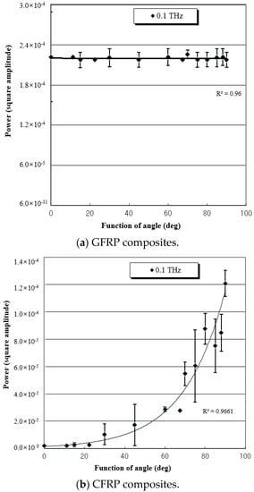 Figure 6 exhibits the amplitude profile of the penetrating power of both the GFRP and CFRP composites by the function of angle under the frequency of 0.1 THz. The amplitude profile of power was obtained, with values ranging from 0° to 90° for both the GFRP composites and CFRP composites. Notably, in the case of the GFRP composites, there was no change in the amplitude profile. However, the CFRP composites showed a higher amplitude of penetrating power at 90°, although they showed almost no amplitude of penetrating power at 0°. When the measurement was made, the GFRP composites were not dependent on any angle, but the CFRP composites were dependent on the angle of the carbon fibers.