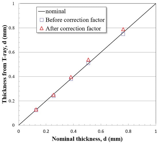 The relation between the nominal thickness and the thickness measured from the T-ray techniques in the Shim stock films.