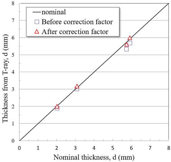The relation between the nominal thickness and the thickness measured from the T-ray techniques in the GFRP composites.