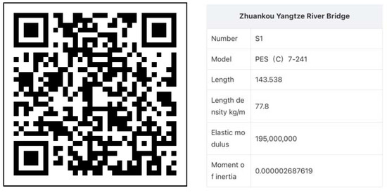 Based on the basic cable information of the entire bridge, including project name, cable number, cable length, mass per unit length, flexural stiffness, etc., a standard form of cable data was created and shown in Table 2. Based on the standardized compilation of cable information, a waterproof QR code was generated, linked and attached to the corresponding stay cable, as shown in Figure 1.