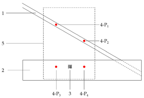 According to the requirements of target identification and displacement correction, four simple targets are attached, as shown in Figure 3. To illustrate, the number 1 element refers to a stay cable, the number 2 element is a fixed structure such as a retaining wall/guardrail and the number 3 refers to the QR code for stay cable information. Monitoring targets 4-P1 and 4-P2 are attached on the stay cable, while 4-P3 and 4-P4 are targets attached on the fixed structure. The dotted bordered rectangle (i.e., number 5) denotes the viewing area from the mobile phone. It is worth noting that the position of target 4-P1 should be as high as possible: 4-P2 is 1 m~2 m away from 4-P1, and 4-P3 and 4-P4 are below 4-P1 and 4-P2 in order to fix the structure.