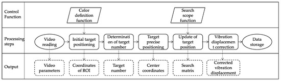 The image sequences of cable vibration will be processed following the procedures in Figure 4. The processing starts with target identification, tracking and ends with displacement correction. As a result, the distance between the stay cable target and the fixed point in each frame of the image can be obtained. Based on that, the time history matrix of target vibration was established, and the stay cable force can be obtained by substituting fundamental frequency of the cable vibration into the calculation formula. The entire image processing scheme is shown in Figure 4.