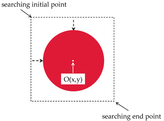 According to the characteristics of a circle, the intersecting red pixel of the largest row and the largest column was marked as the circle center. While searching for the largest row (or largest column), there will be multiple largest rows, and the median of all the largest rows is regarded as the center of the circle. Figure 6 illustrates the initial point and end point for target center searching. Since there is no significant change in the shape and brightness of each target during video shooting, each frame of image adopts the same positioning algorithm. The tracking accuracy is slightly less than that using template matching or circle center fitting, and the calculation time is greatly reduced.