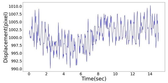 Distinct from previous approaches using fixed cameras to collect vibration video of cables, in this study, inevitable shaking of the handheld terminal exists. As a result, the shooting angles and distances will constantly change in the video data, which adversely impacts the displacement measurement. In order remove such noise, the distance between two fixed points on the structure is used for correction. Specifically, the actual distance between P3 and P4 remains unchanged, yet the pixel distance varies in different frames. Thus, the pixel distance in the i-th frame reflects the noises caused by the handheld shooting method. By multiplying a correction coefficient, , the estimated distance between targets on the cable in the i-th frame will be corrected. The displacement-time history is presented in Figure 7.