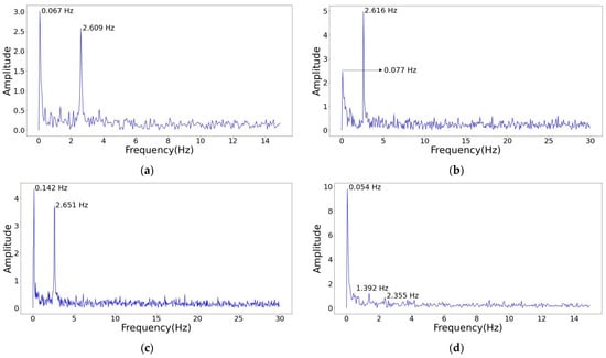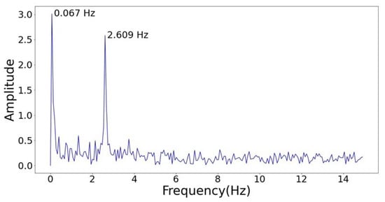 Based on the corrected target displacements, a fast Fourier transform (FFT) is performed in order to obtain the frequency spectrum. Take the displacement-time history in Figure 7 as an example, the corresponding spectrum analysis results are shown in Figure 8 where the first peak represents the direct current component and the second peak occurs at the frequency of 2.609 Hz. The exemplified spectrum does not present a pattern of multiple peaks with constant frequency difference.