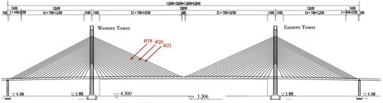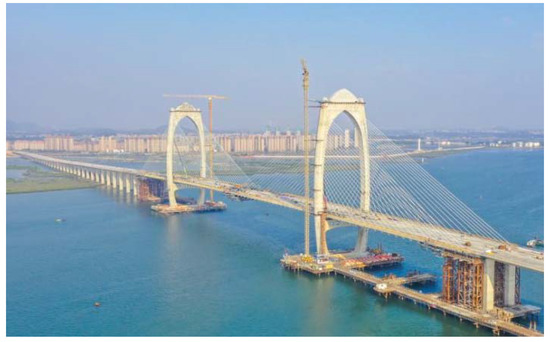The Shuidongwan bridge is located in Maoming City, Guangdong Province in China. It has a total length of 3.333 km. The main bridge is a prestressed concrete cable-stayed bridge with double towers and double cable planes, featuring a main span of 328 m length and side spans of 150 m length each on either side. The main bridge, as shown in Figure 9, was chosen for the experiment.