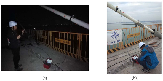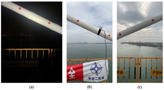 Three stay cables, i.e., 18#, 20# and 21#, were selected for the test. They are located at the middle span, linking the western tower and the girder, as shown in Figure 10. The experiment was conducted during both daytime and night-time. The wind speed level during tests is 2~3. An iPhone XS was used to collect video data, its video resolution was set to be 1080 P (1920 × 1080) or 4 K (3840 × 2160) and frame rates were set to be 24 FPS, 30 FPS or 60 FPS. When cable vibration is not obvious, manual excitation can be applied. The pre-designed targets were attached to the three chosen cables, as indicated in Figure 11. A standardized filming of cable vibrations was carried out according to Section 2.1, and the on-site picture is shown in Figure 12a.