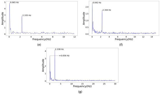 Spectrum analysis under seven on-site working conditions. (a) Working condition 1. (b) Working condition 2. (c) Working condition 3. (d) Working condition 4. (e) Working condition 5. (f) Working condition 6. (g) Working condition 7.