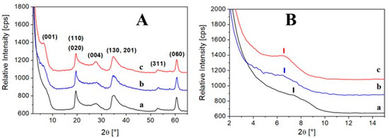 X-ray powder (XRPD) diffractograms were collected on unoriented ground powders with a ThermoARL X’TRA-048 Powder Diffractometer (Thermo Fisher Scientific, Waltham, MA, USA) with a Cu-Kα1 (λ = 1.54062 Å) monochromatic radiation. Diffractograms were recorded at room temperature (RT) in the 2°–65° 2θ range with a step size of 0.02° and a rate of 1.0°/min. The X-ray profiles at low angles (2–15° 2θ) were collected with narrower slits and rate of 0.25°/min.