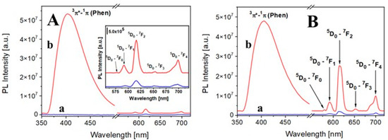 The emission spectra of Phen–GdEuSAP samples, collected under irradiation at both 290 (λexc of Phen) and 395 nm (λexc of Eu3+) (Figure 3), showed that upon direct excitation of the antenna group there is a marked increase in the intensity of the hypersensitive 5D0-7F2 transition at 615 nm of Eu3+ compared to the direct excitation of the lanthanide, thus confirming the interaction of Phen molecules with Eu3+ sites and the occurrence of the ligand-to-metal energy transfer phenomenon [36,37,50]. The emission spectra of both hybrid materials excited at 290 nm (λmax of Phen) shown in Figure 3 also show a broad emission band centered at 415 nm associated with the residual T1 → S0 (3π* → 1π) electronic transition of Phen [46,47,48,49,54] (Figure S5B).