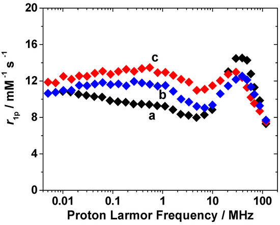 1/T1 1H-NMRD profiles of Na–GdEuSAP (a), Phen–GdEuSAP_1 (b) and Phen–GdEuSAP_2 (c) at 37 °C, over the frequency range 0.01–120 MHz and neutral pH.