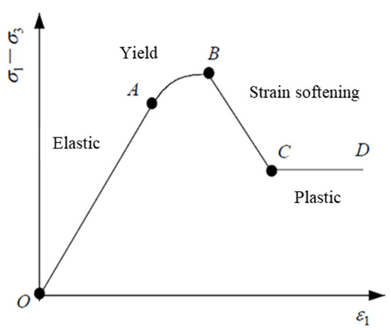 The stress-strain curve can be divided into four segments, as shown in Figure 2. The OA segment is the elastic stage, indicated by a straight line; the AB part is the unloading yield phase, from which the rock is plastically deformed due to the unloading. The stress-strain relation in this state is a curve, which is in line with the elastoplastic constitutive model, and gradually reaches the peak strength with the increase of the unloading amount; the BC section is the stress-decreasing stage after the peak, and the unloading damage of the rock sample is mainly brittle damage, which can be expressed by linear strain-softening; the CD section is the ideal plastic phase, where the rock reaches the residual strength and shows obvious plastic mobility.