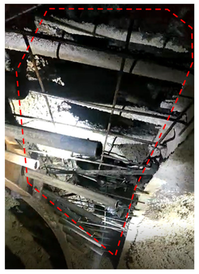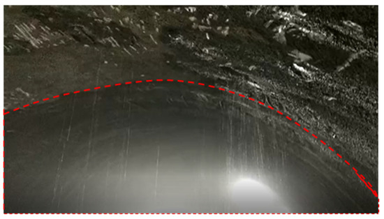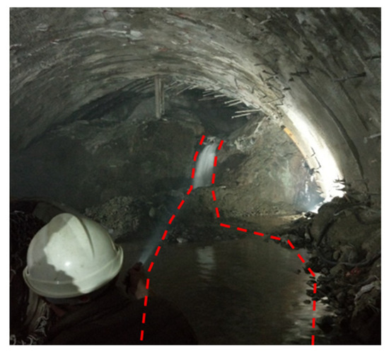 In practical engineering, the water-softening effect on rock is usually accompanied by previous unloading softening. Moreover, differential water–rock interaction is caused due to the initial variability of fracture development and its permeability. The surrounding rock in section K14 + 885~K14 + 935 of Xujiadi tunnel is dolomitic limestone. The groundwater in this section is highly developed. After excavation, there is a large amount of water flowing out from the vault in a sprinkling or gushing way, as shown in Figure 3. The rock mass before encountering water can maintain a specific shape. However, after water immersion, the rock mass softens and disintegrates into “melon pieces” of debris, as shown in Figure 4.