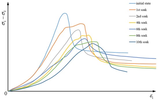 The typical unloading stress-strain curve of rock during water–rock interaction is illustrated in Figure 5 [49]. denote the axial stress, confining pressure, and axial strain, respectively. From Figure 5, it can be seen that the unloading stress-strain curves of the rocks are mostly the same at different water–rock interaction times and can be roughly divided into compaction phase, elastic phase, yield phase, damage phase, and residual phase. With the increase of the times of water–rock interaction, the stress-strain curves of rock samples have some obvious trends: the compaction phase gradually grows, the slope of the elastic phase gradually decreases, the yield phase gradually becomes apparent, the peak strength gradually decreases, the axial strain corresponding to the peak strength gradually increases, the drop of stress-strain curve slows down gradually, the brittle damage characteristic gradually weaken, and the residual strength also gradually decreases. It concludes that the rock sample tends to become softer under the water–rock interaction.