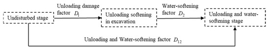In the excavation of the water-rich soft-rock tunnel, according to the analysis in Section 2, the surrounding rock environment is in order of the natural undisturbed state, excavation unloading damage soften state, unloading and water-softening state. Assuming that is the unloading damage factor of the surrounding rock, is the water-softening factor, is the damage factor of two-damage coupling. Figure 7 shows the relationship between damage factors and surrounding rock states.