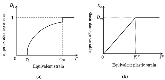 where, and are the damage variables in tensile damage and compression shear damage, respectively; is the residual tensile strength of rock; is the maximum elastic tensile strain; is the ultimate tensile strain; is the equivalent strain; is the initial elastic modulus of rock; is the equivalent plastic strain; is the equivalent plastic strain when rock reaches residual strength; is the damage variable when rock reaches the residual stage.