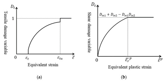The approach of Mazars to extend the one-dimensional damage to three dimensions is adopted, and the equivalent tensile strain is used to replace the uniaxial tensile strain as the softening parameter [35,63,64,65,66]. Concerning Mazars’ approach, the expression for the damage threshold and damage variable of the tension element are given as:
