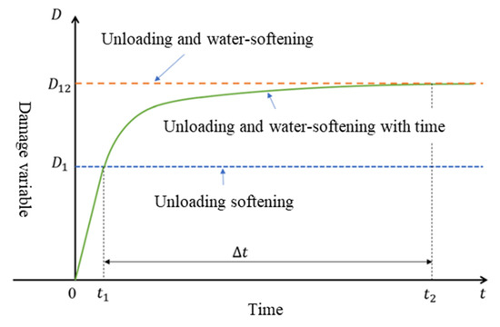 Surrounding rock unloading softening time is short. This paper assumes that the damage variables in this period are linear, while the water-softening time is longer. Xia Dong [53] studied the deformation and strength parameters of saturated rock samples with water immersion time and concluded that each physical and mechanical parameter of the rock is exponentially related to time. In this paper, assuming that the damage variables of the surrounding rock obey exponential variation with water-softening time, then: