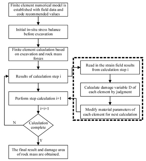 As for the application of the damage model, Liu et al. [35] established a numerical analysis model of unloading relaxation of rock mass and applied it to the simulation of slope excavation to dynamically simulate the excavation process of a slope. Some articles studied the relationship between post-peak mechanical properties of rock and strain-softening phenomenon, derived the damage evolution equation with softening parameters as variables, and proposed some methods to consider unloading damage effect in finite element numerical calculation [36,37,38]. Lin Peng [39] studied the progressive water inrush caused by particle loss and seepage failure, established a new evolution model of particle loss rate and permeability, and applied it to fluid-solid coupling calculation. Molladavoodi et al. [40,41] used the proposed damage model to simulate of simple loading conditions such as uniaxial tensile and compressive tests and practical and complicated loading conditions such as tunnel excavation. Cho et al. [42] investigated the effect of strain rate on the damage and failure of tuff through finite element method, which found the tensile strength increases with the increase of strain rate. Armero et al. [43] embedded the finite element into the discontinuous algorithm, established the tensile strength criterion with the maximum normal stress, and analyzed the rock damage and failure process, which is in good agreement with the test. Manouchehrian et al. [44] used an explicit finite element to simulate the unstable rock failures under different unloading conditions. However, most researches about damage simulation focused on the unloading effect; few are based on the unloading and water-weakening coupling damage models. Not to mention considering the time effect in the softening process.