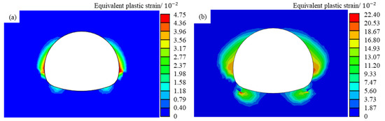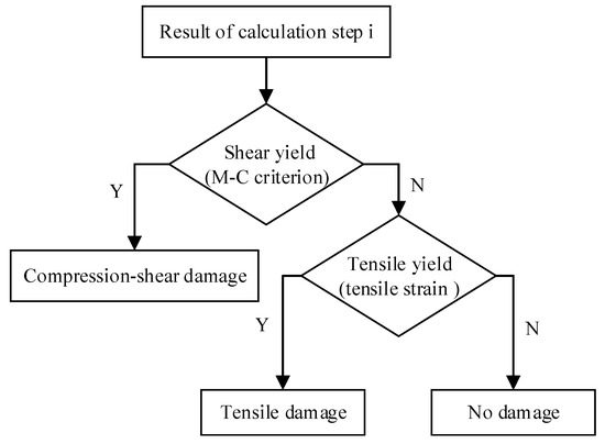 At present, most of the damage studies of surrounding rock focus on compression shear yield damage, and the study of tensile yield damage is insufficient. Therefore, this paper considers both compression shear and tensile damage modes. Some scholars add the maximum tensile strength criterion to the Mohr–Coulomb strength criterion, trying to make material yield in tension by setting the tensile strength [62]. However, in the simulation, the damage caused by tensile strain is usually the result of compressive stress and excavation unloading, so the tensile strain should be used as an indicator to determine the tensile damage of the surrounding rock.