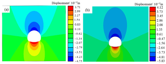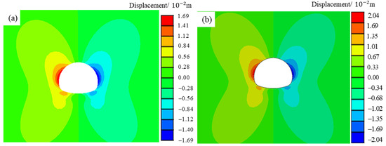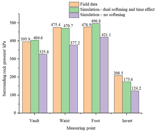 By comparing the calculated results of different models, the results of the fluid–solid coupling without softening are much smaller than that of new-proposed method considering unloading, water-softening, and time and field monitoring results, which fully indicates that because in the fluid–solid coupling, the physical-mechanical parameters of the surrounding rock element (e.g., ) do not deteriorated with the softening process. When some elements’ parameters should be deteriorated due to softening but still keep the initial condition involved in the calculation, then local yielding damage of surrounding rock will not occur. Therefore, the excavation of rock elements still maintains a good integrity and deformation modulus, resulting in a smaller interaction pressure between the surrounding rock and support than the field monitoring data. On the contrary, in the model, considering unloading softening, water-softening and time effect, the mechanical parameters of surrounding rock units change accordingly with the construction process, environment, and time so that the final calculation results are in better agreement with the field monitored values. In addition, all the calculated results are consistent with the trend of the pressure distribution monitored in the field, i.e., the surrounding rock pressure at the foot of the arch is greater than the pressures at the waist of the arch and the pressure at the vault is the smallest, which also shows the reasonableness of both calculations. At the inverted, the multi-field coupling model calculated results have about 16.7% error with the monitoring results, while the fluid–solid coupling model calculated results have about 40.4% error. As the invert is subjected to much smaller surrounding rock pressure than other monitoring positions, and typically is not the weak position of the tunnel, it is not discussed in this model.