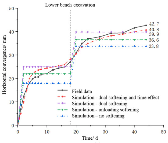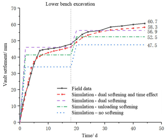 According to the comparison of different curves in Figure 20 and Figure 21, when the flow–solid coupling without considering the effects of softening and time is used, the calculated vault settlement and horizontal convergence are 47.5 mm and 33.8 mm, which are smaller than the monitoring results by about 21.7% and 20.8%, respectively. When the calculation model only considers the softening of excavation unloading, the calculated vault settlement and horizontal convergence are 52.5 mm and 36.6 mm, which are smaller than the monitoring results by about 13.5% and 14.3%, separately, which are closer to the field monitoring value than the fluid–solid coupling without considering softening effect. When the simulation simultaneously considers the dual damage of excavation unloading and water-softening without time, the final calculated vault settlement and horizontal convergence are 56.9 mm and 39.9 mm, which are smaller than the monitoring results by about 6.3% and 6.6%, respectively. However, if the simulation does not involve the time variation, then the calculated deformation of surrounding rock only occurs at the excavation moment, which means the surrounding rock deformation is only related to the construction steps and has nothing to do with time. Although the model can calculate the final vault settlement and horizontal convergence more accurately, it cannot reflect the variation of surrounding rock displacement with time during the construction, nor can it predict the appropriate support time during the design and construction. So, when the simulation considers excavation unloading, water-softening and time effect at the same time, the calculated vault settlement and horizontal convergence are 58.3 mm and 40.8 mm, which are about 4.0% and 4.4% different from the monitoring results, respectively, and the error is minimum compared with other cases. The calculated results considering time effect are not greatly different from the results without time effect, but the deformation curve of the surrounding rock calculated by the time-effect model has an obvious trend of “rapid rise–slow growth–rise again–final stabilization”, which matches well with the development of the site monitoring data and provides a good reference for the site construction.