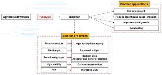 Biochar has many different aspects of application in agriculture, the main examples of which aim to increase soil fertility, increase nutrient uptake, and improve the water retention capacity of the soil. This will simultaneously improve crop productivity, mitigate plant stresses related to both salinity [16,21] and toxic contaminants [22,23], and reduce dependence on fertilizers [24,25]. Biochar application directly affects soil physicochemical characteristics such as pH, nutrient availability, electrical conductivity, porosity, surface area, bulk density, and cation exchange capacity (CEC) [26,27], and influences soil microbial structure by providing additional habitats to the microbial populations [28]. Biochar was also reportedly able to remediate organic and inorganic pollution in the soil by complexation or through sorption [29,30]. Biochar has stable aromatic organic carbon. This carbon is hardly degraded and therefore does not return to the atmosphere [31,32]. This will, in fact, minimize CH4 and N2O emissions to the atmosphere and consequently reduce climate change [33]. The features of biochar essentially depend on both the type of feedstock and the pyrolysis conditions. Consequently, many biochar types with many different properties may be produced from different types of biomasses and at a broad range of pyrolysis temperatures [34]. The high variation in the chemical and physical characteristics of biochar, despite its highly documented benefits for soils, still imposes some limitations on its applications in agriculture [35,36,37].