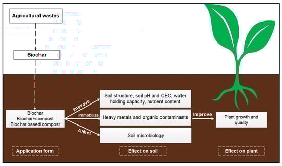 Biochar has been described as an attractive material that can be applied in agriculture to improve agricultural soil properties and crop productivity. The main impacts of biochar on soil characteristics and agricultural products yield are listed in Table 2 and Figure 2.