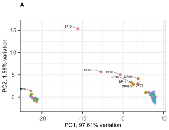 The BLAST search of the obtained phage sequences resulted in a hit list of Lactococcus phage sequences of high sequence identity. However, the degenerate nucleotide codes are treated by the BLAST algorithm as mismatches in nucleotide alignment [14]. The hit lists for all of the sequence searches were combined, and duplicate records were removed to build a local database. The local database was used to calculate the reference matrix of sequence distance measures with DECIPHER library [16], with substitution matrix accounting for ambiguous nucleotides for all IUPAC nucleic acid codes, as described previously. This way, we created sample composition-independent measures for global phage diversity analysis. The global distance measures were used for principal component analysis (PCA) to visualize differences and similarities in phage-type composition in analyzed samples. Sequences derived from BLAST search hits used for distance measures cluster tightly together (Figure 5), and metagenome-derived sequences form on the plot distant, more dispersed clusters separate for dairy plant and spontaneous fermentation cheeses with single outliers DP02(c2), SF01(936), and SF06(P335).