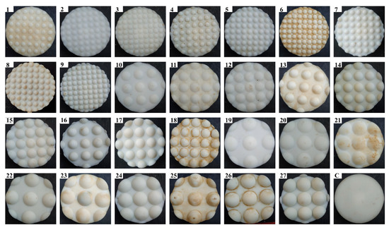 The full factorial design of control parameter levels according to the L27 (33) Taguchi orthogonal array, in addition to the flat disc (C), which uses as a control.