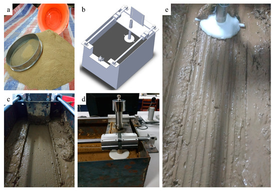 Experimental setup for the sliding resistance test: (a) the sieved soil; (b) creating an appropriate soil bin to test sliding resistance; (c) flattening and smoothing of soil surfaces; (d) exposing the soil paste to constant normal stress of 1025 N·m−2 for one minute; (e) pulling the test disc for 40 cm of soil bin length.