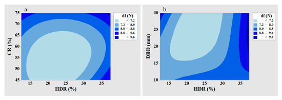 Effect of control parameters on sliding resistance according to an L9 (33) Taguchi orthogonal array: (a) contour plot of sliding resistance vs. CR, HDR; (b) contour plot of sliding resistance vs. DBD, HDR.
