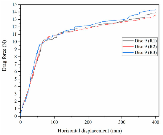 The main experiment was conducted according to an L27 (33) full factorial design with three replications. Table 3 shows the mean drag force along each disc stroke and the geometrical specifications of the various discs. The minimum drag force was 6.6 N with the parameter combination (Disc 23). In comparison, the maximum drag force was 10.9 N with the parameter combination (Disc 9). The highest achieved difference in the measured values of the replications was 0.8 N, indicating that the test results utilizing the testing method described in this study were repeatable (Figure 6).