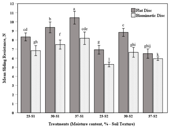 The sliding resistance of the optimized domed disc (Disc 14) and that of the flat disc were compared under certain soil conditions (soil textures of silty loam and sandy clay loam; soil moisture contents of 23%, 30%, and 37%) to investigate the biomimetic effect of the optimized domed disc. The optimized domed disc produced less sliding resistance than the flat disc in all treatments, by around 9% to 25%, depending on the soil conditions. The results obtained in this experimental study can be used to support the manufacture of paddy soil–engaging components such as flattening tools and fertilizer furrow openers.
