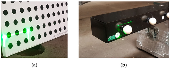After reviewing the available standards, it was concluded that the system accuracy test would be performed using a ball-bar type standard. The ability of the system to acquisition and recognize the reference spheres images was verified prior to measurements. The image obtained during the ball-bar scan was compared with the image obtained during the scan of the calibration board (Figure 3). For the compared standards, no significant differences were observed. Due to the target range of dimensions tested and the lack of differences in recognizing reference features, the ball-bar standard made of carbon fiber with the near-zero thermal expansion factor (α = 0.2 × 10−6 K−1) and with a nominal length of L = 3000 mm was selected to assess the system accuracy.