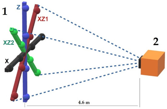 The ball-bar standard placement in the workspace of the laser projector was designed considering the ISO 10360 group recommendations. Two axial settings were defined: X and Z and two diagonal two-dimensional settings: XZ1 and XZ2. The layout of the standard is shown in Figure 4.