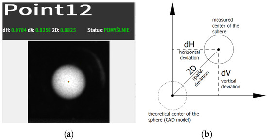 Projector software provided the position error value of the reference spheres as vertical (dV) and horizontal (dH) deviations in the local coordinate system and their combination. Deviations were calculated as the difference between measured and nominal positions of spheres and given as absolute values. Nominal positions were taken directly from the CAD and could not be modified. Thus, the CAD model of the reference object must be built based on the calibrated positions of references spheres in the local coordinate system. The view of the control window with the listed deviations and the geometric error representation is shown in Figure 5. The spatial deviation, defined as 2D in Figure 5, was used to assess the system’s accuracy. Figure 6 represents the CAD model of the used ball-bar standard in the laser projector software.