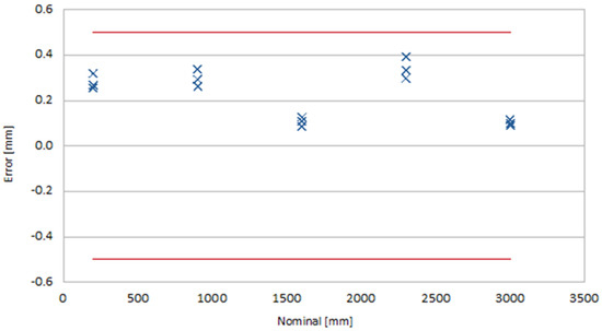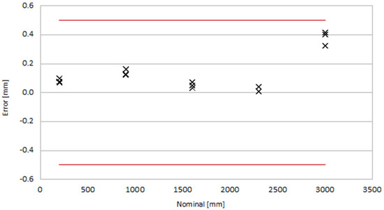 For the X-axis, the minimal average error of 0.02 mm was obtained for the 2300 mm nominal. Below this length, the error was up to 0.2 mm. The range of results remained between 0.03 mm and 0.04 mm. Error increases significantly to 0.4 mm, also the range nearly triples to 0.09 mm for the 3000 mm nominal. The characteristic of the X-axis measurement errors is shown in Figure 7.