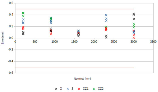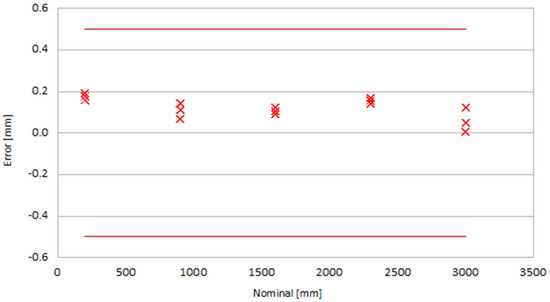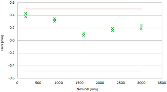 The minimal average error of 0.1 mm was obtained for the Z-axis for 1600 mm and 3000 mm lengths. The range of the results remained at 0.04 mm and 0.03 mm, respectively. For the other checked lengths, the average range was 0.07 mm. The characteristic of the Z-axis measurement errors is shown in Figure 8.